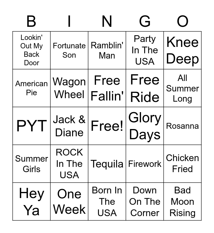 This bingo card has a free space and 50 words: Pink Houses, Bad Moon Rising, American Woman, Born In The USA, ROCK In The USA, American Girl, Fortunate Son, Proud Mary, American Pie, Small Town, Wagon Wheel, Party In The USA, Chicken Fried, Firework, Take Me Home Country Roads, Country Girl Shake It For Me, Free Fallin', Glory Days, Sweet Home Alabama, Knee Deep, Jack & Diane, Down On The Corner, Lookin' Out My Back Door, Free Ride, Blinded By The Light, Rock & Roll All Nite, All Summer Long, All Right Now, Ramblin' Man, Tequila, Island In The Sun, Rich Girl, Hurts So Good, Take It Easy, One Week, Breakfast At Tiffany's, Rude, Your Love, Angel, Rosanna, Summer Of 69, Call Me Maybe, Man I Feel Like A Woman, I Wanna Dance With Somebody, Hey Ya, PYT, All Star, Miami, Summer Girls and Take The Money & Run.