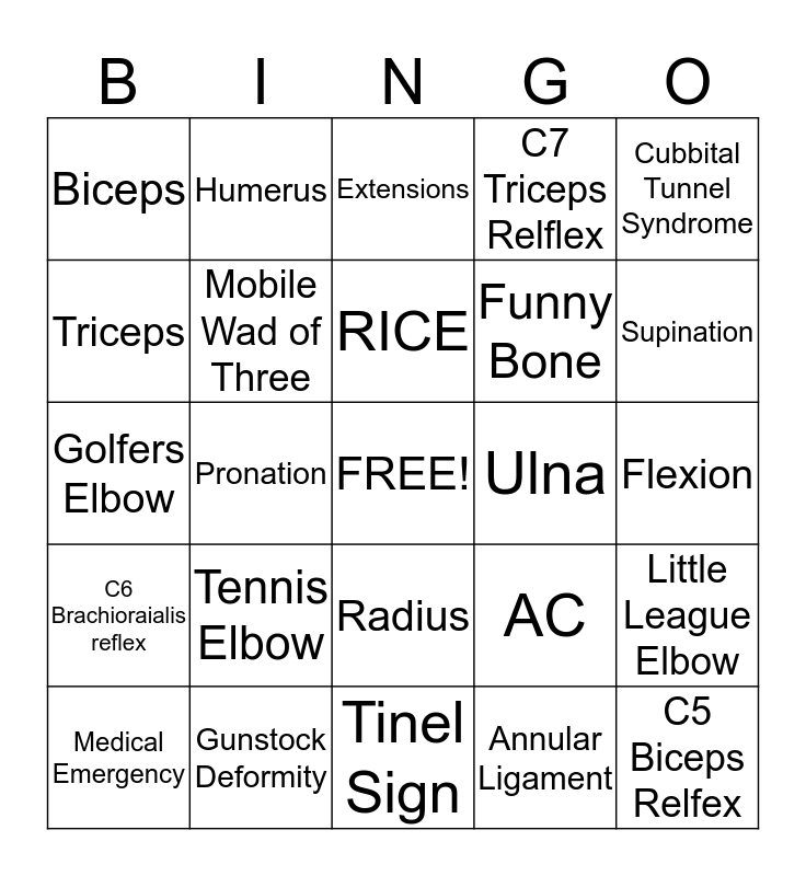This bingo card has a free space and 24 words: Tennis Elbow, Gunstock Deformity, RICE, Medical Emergency, Cubbital Tunnel Syndrome, Biceps, Triceps, Humerus, Ulna, Radius, Funny Bone, Golfers Elbow, AC, Little League Elbow, Mobile Wad of Three, Annular Ligament, Flexion, Extensions, Supination, Pronation, C5 Biceps Relfex, C6 Brachioraialis reflex, C7 Triceps Relflex and Tinel Sign.
