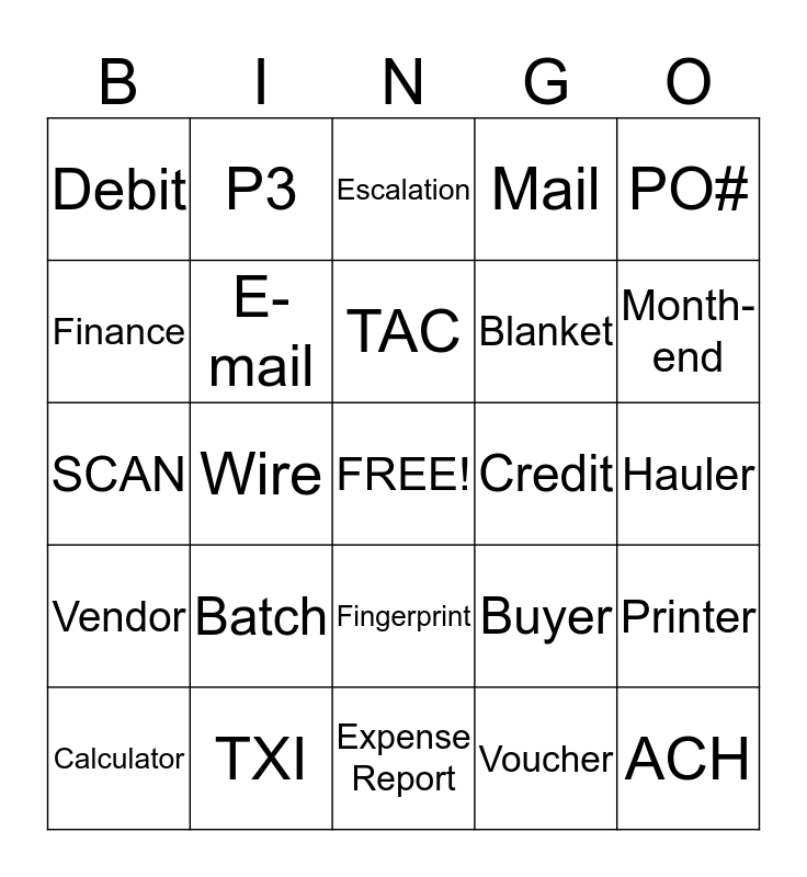 This bingo card has a free space and 30 words: TXI, Addendum, Wire, Due Date, Debit, Escalation, E-mail, Fingerprint, Credit, Expense Report, Hauler, ACH, Voucher, Bottomline, Month-end, Invoice, Buyer, Vendor, Batch, PO#, SCAN, Checks, P3, Blanket, Finance, Mail, Printer, Calculator, TAC and TAP.