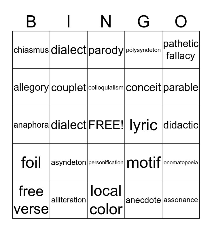 This bingo card has a free space and 24 words: asyndeton, alliteration, colloquialism, free verse, pathetic fallacy, chiasmus, allegory, dialect, lyric, personification, conceit, anaphora, motif, onomatopoeia, couplet, anecdote, didactic, parody, parable, dialect, assonance, foil, polysyndeton and local color.