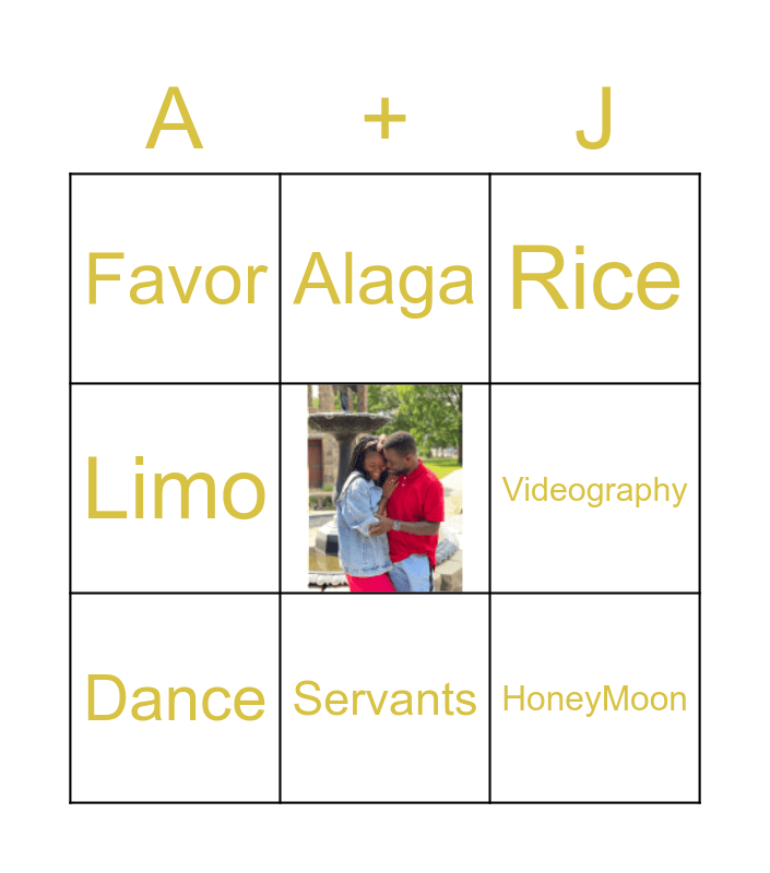 This bingo card has a free space and 11 words: Aso Ebi, Servants, HoneyMoon, Dance, Alaga, Rice, Videography, Cake, Limo, Favor and Decor.