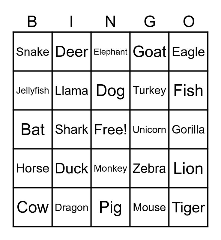 This bingo card has a free space and 42 words: Cat, Dog, Chicken, Duck, Mouse, Lion, Tiger, Bear, Elephant, Monkey, Gorilla, Fish, Shark, Eagle, Giraffe, Zebra, Crab, Bat, Octopus, Deer, Jellyfish, Dinosaur, Racoon, Snake, Peacock, Frog, Turkey, Owl, Fox, Rabbit, Rhino, Horse, Llama, Pig, Turtle, Cow, Dragon, Unicorn, Wolf, Sheep, Goat and Butterfly.