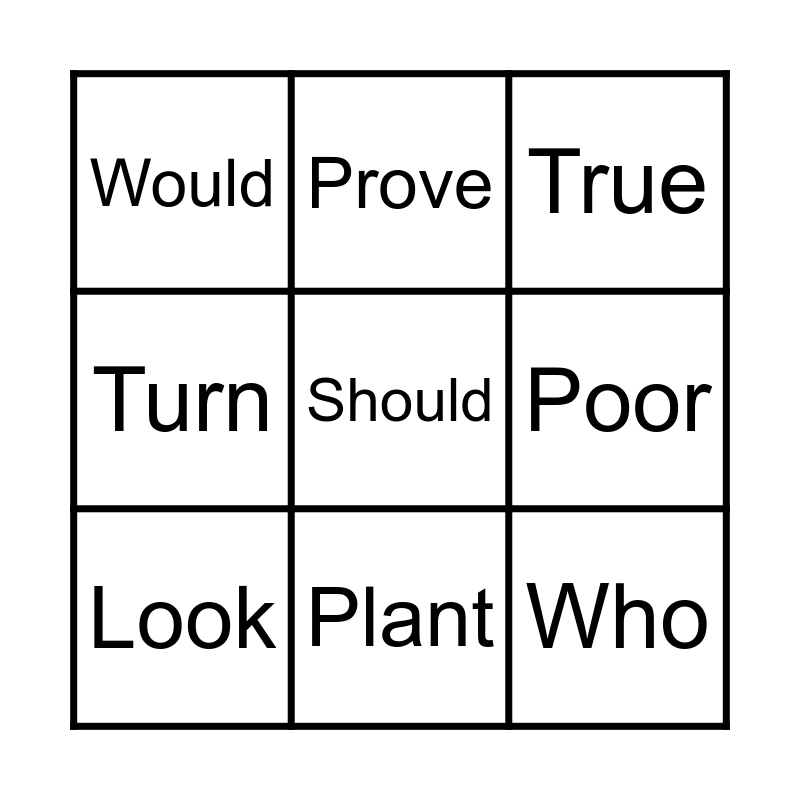 This bingo card has a free space and 26 words: Whole, Wild, Plant, Pretty, Who, Would, Poor, Prove, Sugar, Shirt, Third, Hurt, Clue, Rescue, Flew, First, Turn, Church, True, Few, Grew, The, That, Not, Look and Put.