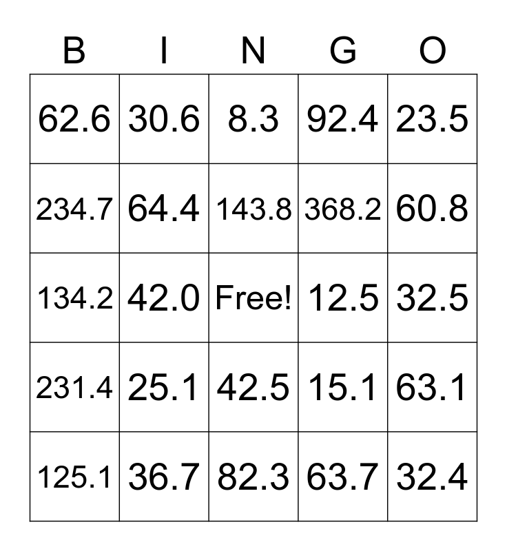 This bingo card has a free space and 24 words: 25.1, 36.7, 143.8, 125.1, 23.5, 62.6, 234.7, 30.6, 12.5, 42.5, 368.2, 134.2, 15.1, 63.1, 64.4, 63.7, 32.5, 8.3, 60.8, 42.0, 32.4, 231.4, 92.4 and 82.3.