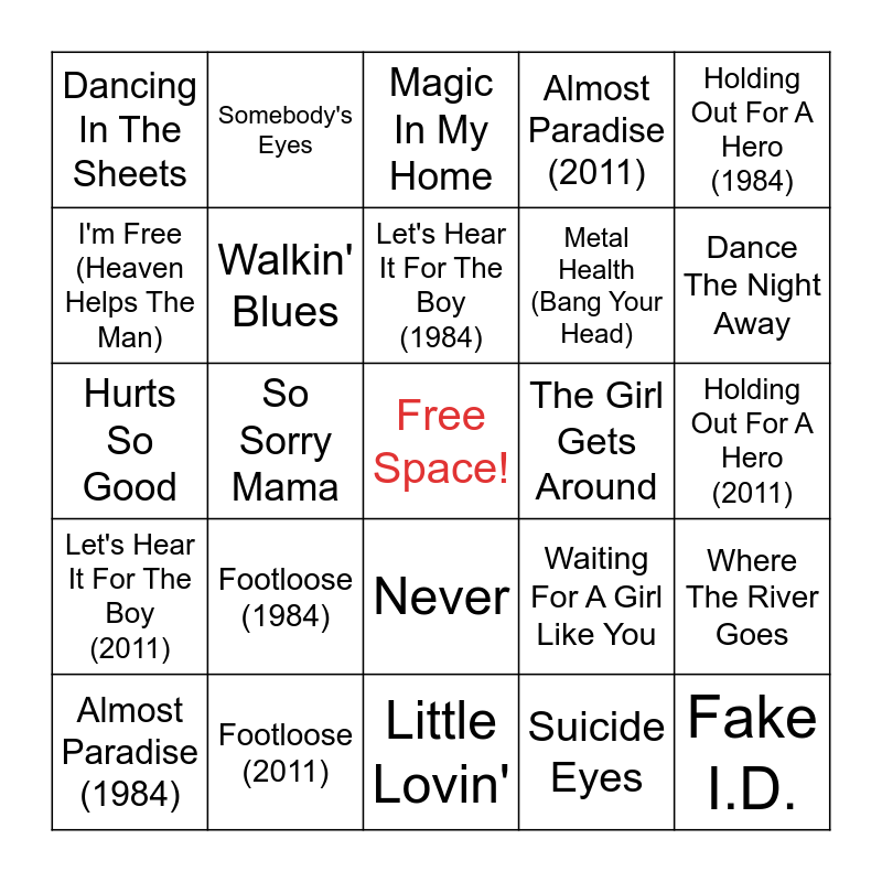 This bingo card has a free space and 24 words: Footloose (1984), Footloose (2011), Let's Hear It For The Boy (1984), Almost Paradise (1984), Holding Out For A Hero (1984), Dancing In The Sheets, I'm Free (Heaven Helps The Man), Somebody's Eyes, The Girl Gets Around, Never, Metal Health (Bang Your Head), Hurts So Good, Waiting For A Girl Like You, Where The River Goes, Walkin' Blues, Suicide Eyes, Holding Out For A Hero (2011), Magic In My Home, Dance The Night Away, So Sorry Mama, Fake I.D., Let's Hear It For The Boy (2011), Almost Paradise (2011) and Little Lovin'.