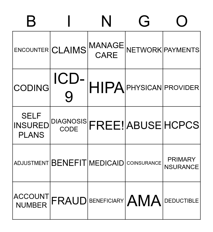 This bingo card has a free space and 24 words: BENEFIT, FRAUD, HIPA, ACCOUNT NUMBER, PAYMENTS, ENCOUNTER, CODING, CLAIMS, ABUSE, MEDICAID, PHYSICAN, SELF INSURED PLANS, COINSURANCE, PRIMARY NSURANCE, ICD-9, AMA, HCPCS, MANAGE CARE, PROVIDER, DIAGNOSIS CODE, DEDUCTIBLE, ADJUSTMENT, NETWORK and BENEFICIARY.