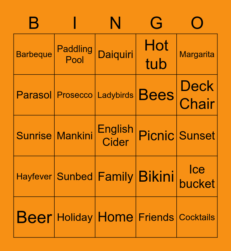 This bingo card has 30 words: Holiday, Camping, Mankini, Sunshine, Barbeque, Daiquiri, Prosecco, Family, Picnic, Home, Sunset, English Cider, Friends, Cocktails, Deck Chair, Icecream, Bikini, Hayfever, Sunbed, Margarita, Sunrise, Garden, Paddling Pool, Bees, Parasol, Hot tub, Ice bucket, Beer, Ladybirds and Music.