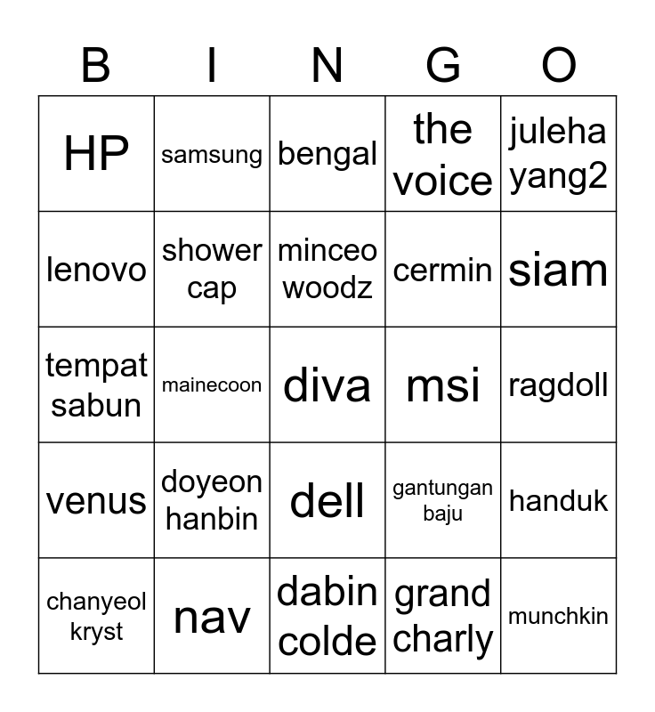 This bingo card has 25 words: doyeon hanbin, dabin colde, minceo woodz, chanyeol kryst, juleha yang2, HP, lenovo, samsung, msi, dell, cermin, tempat sabun, gantungan baju, handuk, shower cap, munchkin, ragdoll, bengal, siam, mainecoon, diva, nav, venus, the voice and grand charly.