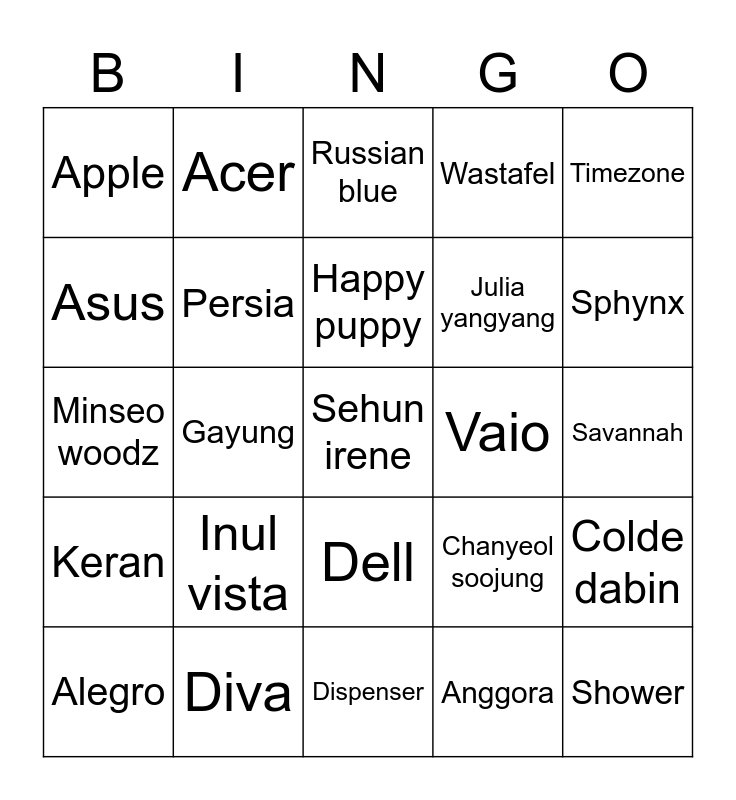 This bingo card has a free space and 24 words: Inul vista, Diva, Happy puppy, Alegro, Timezone, Apple, Asus, Acer, Vaio, Dell, Julia yangyang, Minseo woodz, Chanyeol soojung, Colde dabin, Persia, Anggora, Savannah, Russian blue, Sphynx, Gayung, Shower, Keran, Wastafel and Dispenser.