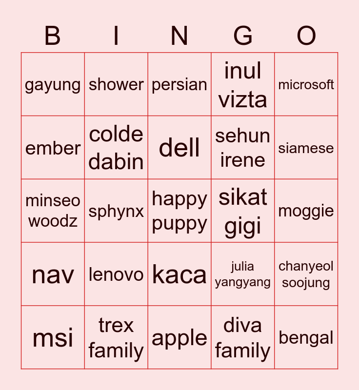 This bingo card has 25 words: lenovo, apple, dell, msi, microsoft, gayung, ember, shower, sikat gigi, kaca, sehun irene, minseo woodz, julia yangyang, chanyeol soojung, colde dabin, bengal, moggie, persian, siamese, sphynx, happy puppy, trex family, nav, inul vizta and diva family.