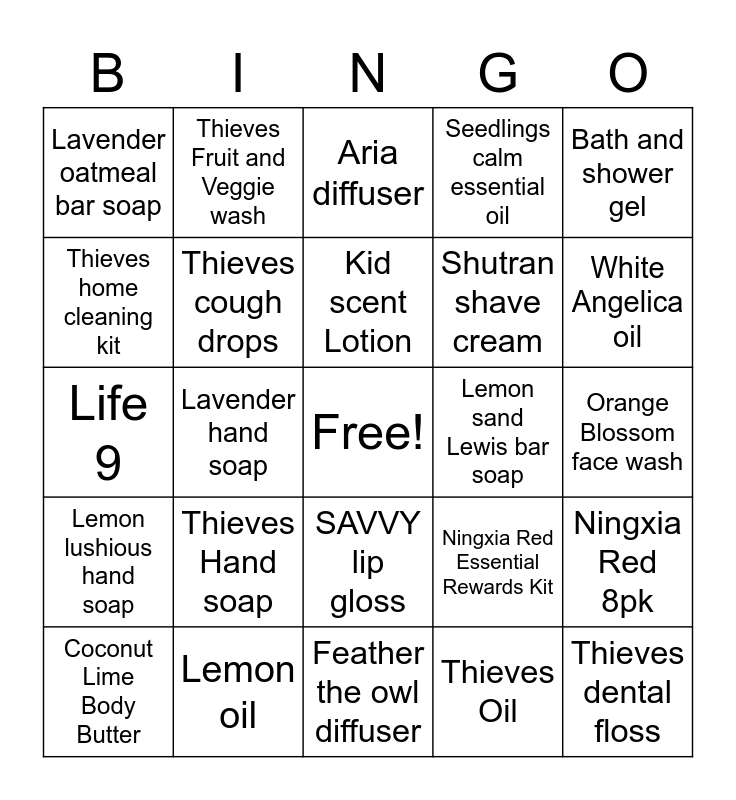 This bingo card has a free space and 53 words: Thieves toothpaste, Thieves dental floss, Thieves dish powder, Thieves Oil, Thieves Hand soap, Thieves Mouthwash, Thieves Fruit and Veggie wash, Thieves hand sanitizer, Thieves home cleaning kit, Thieves Spray, Thieves cough drops, Ningxia Red 2pk, Ningxia Red 8pk, Ningxia Red Essential Rewards Kit, Lavender Lotion, Coconut Lime Body Butter, Kid scent Lotion, Lemon sand Lewis bar soap, Charcoal bar soap, Bath and shower gel, Lavender hand soap, Thieves hand soap refill, Shutran shave cream, Lavender oatmeal bar soap, Essential oil bottle labels, Lemon oil, Peppermint oil, Valor oil, Cedarwood oil, White Angelica oil, Tangerine oil, Lime oil, CBD calm roller, CBD muscle rub, Purification oil, Seedlings baby wipes, Seedlings calm essential oil, Feather the owl diffuser, Aria diffuser, ART skincare line, Wolf berry eye cream, Cool Azul paint cream, Orange Blossom face wash, Maximum Strength acne treatment, SAVVY powder foundation, SAVVY lip gloss, Super C, Immupro, Life 9, Lemon lushious hand soap, Vanilla protein powder, Lantern diffuser and USB diffuser.