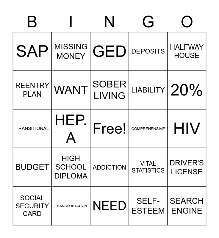 This bingo card has a free space and 24 words: SOCIAL SECURITY CARD, HIGH SCHOOL DIPLOMA, SOBER LIVING, SELF-ESTEEM, HALFWAY HOUSE, SAP, MISSING MONEY, GED, COMPREHENSIVE, HIV, TRANSITIONAL, WANT, VITAL STATISTICS, DRIVER'S LICENSE, REENTRY PLAN, TRANSPORTATION, NEED, DEPOSITS, 20%, BUDGET, HEP. A, ADDICTION, LIABILITY and SEARCH ENGINE.
