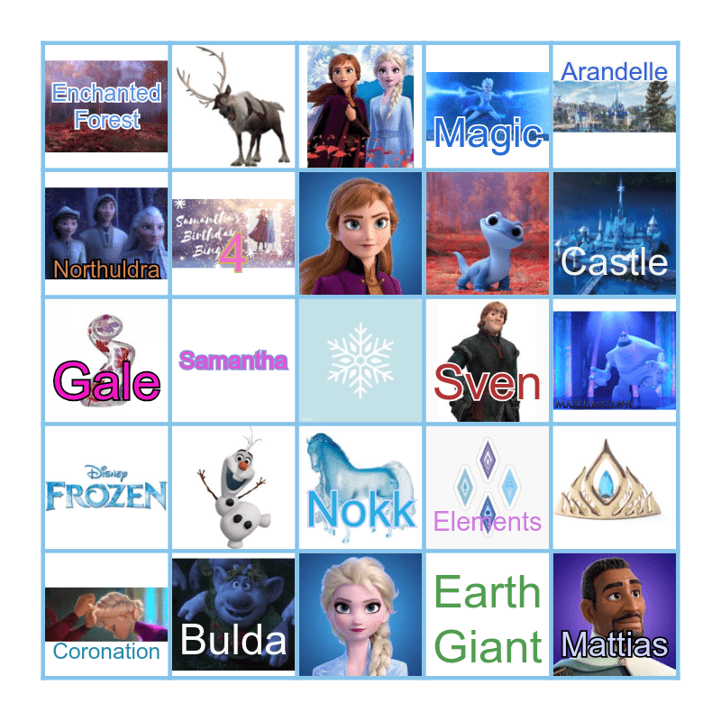 This bingo card has 23 images, a free space and 15 words: Coronation, Arandelle, Enchanted Forest, Northuldra, Sven, Nokk, Gale, Elements, 4, Castle, Samantha, Mattias, Bulda, Magic and Earth Giant.