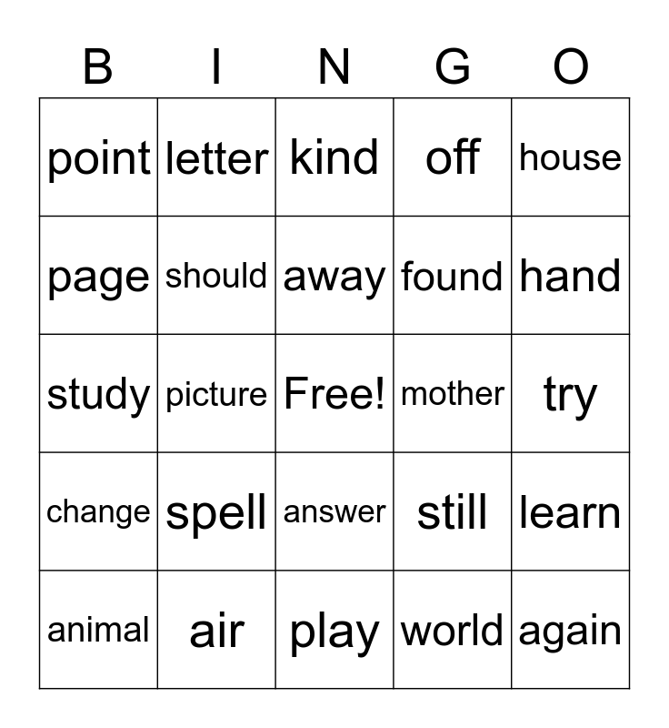 This bingo card has a free space and 24 words: spell, air, away, animal, house, point, page, letter, mother, answer, found, study, still, learn, should, world, try, kind, hand, picture, again, change, off and play.