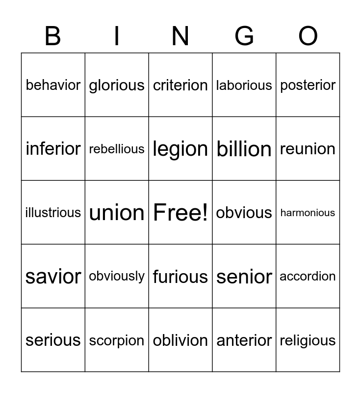 This bingo card has a free space and 35 words: exterior, tedious, champion, rebellious, furious, laborious, inferior, industrious, legion, previous, illustrious, posterior, copious, superior, behavior, obvious, anterior, union, savior, religious, senior, serious, accordion, scorpion, criterion, reunion, million, studious, billion, harmonious, companion, oblivion, obviously, glorious and oblivious.