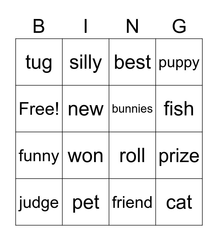 This bingo card has 16 words: pet, prize, best, tug, funny, silly, roll, friend, Free!, new, judge, puppy, won, fish, bunnies and cat.