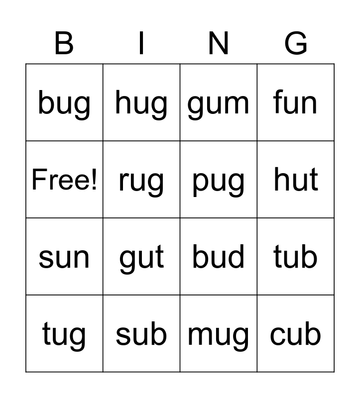 This bingo card has 16 words: sub, tub, gum, bug, sun, hug, bud, mug, Free!, rug, tug, fun, gut, hut, pug and cub.