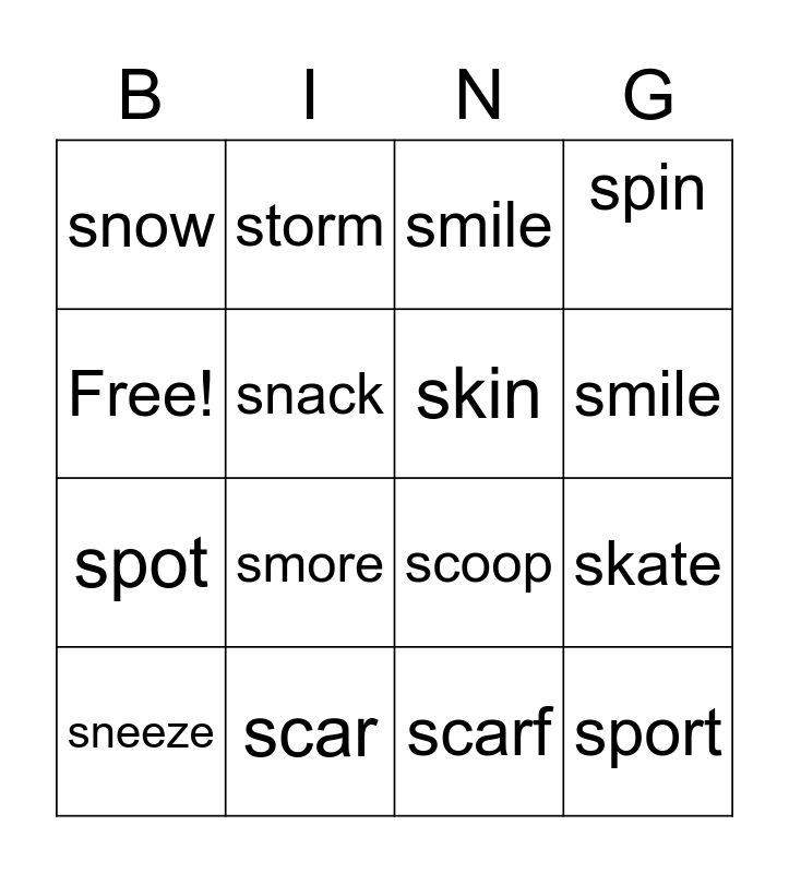 This bingo card has 16 words: scar, skate, smile, snow, spot, storm, scoop, scarf, Free!, snack, sneeze, spin, smore, smile, skin and sport.