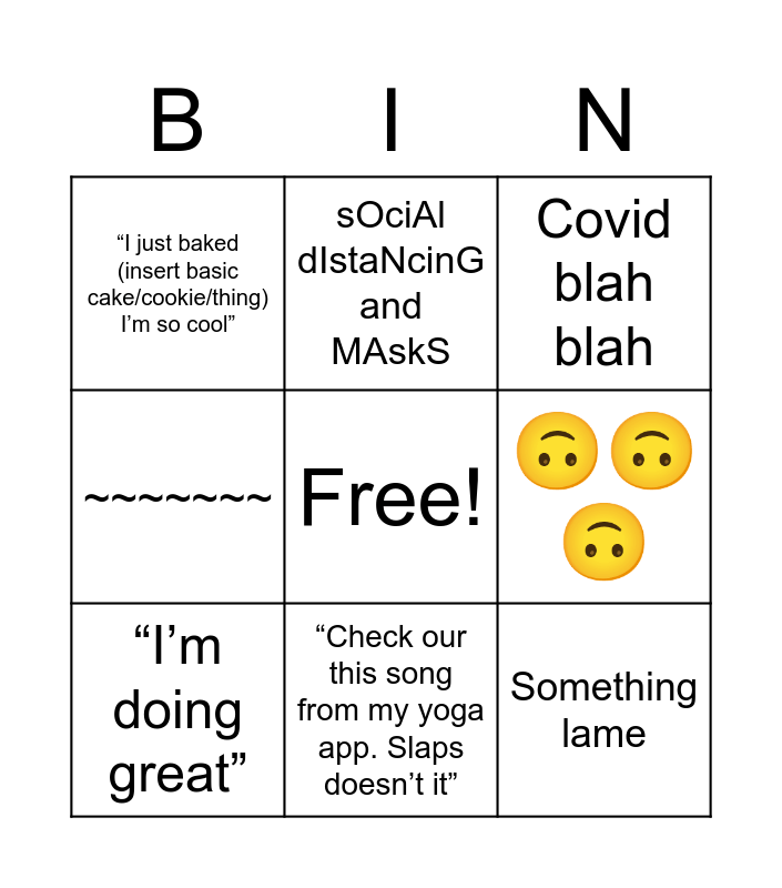 This bingo card has a free space and 8 words: 🙃🙃🙃, Covid blah blah, sOciAl dIstaNcinG and MAskS, “I’m doing great”, “I just baked (insert basic cake/cookie/thing) I’m so cool”, Something lame, ~~~~~~~ and “Check our this song from my yoga app. Slaps doesn’t it”.
