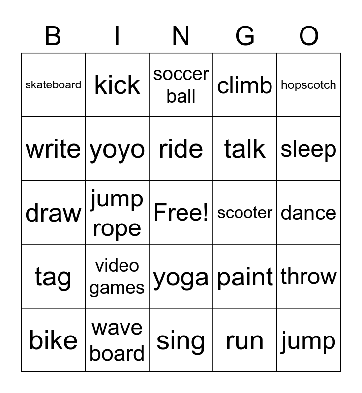 This bingo card has a free space and 29 words: bike, camera, jump rope, kite, skateboard, soccer ball, yoyo, video games, scooter, wave board, dance, jump, sing, run, sleep, walk, yoga, tag, hopscotch, draw, paint, read, talk, write, climb, kick, throw, ride and play.