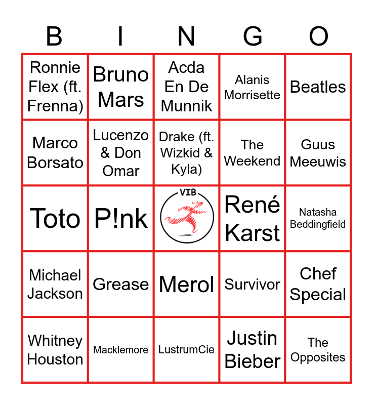 This bingo card has a free space and 32 words: Justin Bieber, Jeugd Van Tegenwoordig, P!nk, Duncan Laurance, Michael Jackson, Lucenzo & Don Omar, Beatles, Chef Special, Bruno Mars, Los Del Rio, Drake (ft. Wizkid & Kyla), Acda En De Munnik, K3, Adele, René Karst, ABBA, Whitney Houston, Toto, Merol, Grease, Survivor, Béyonce, Natasha Beddingfield, Macklemore, The Opposites, Alanis Morrisette, The Weekend, Marco Borsato, Ronnie Flex (ft. Frenna), LustrumCie, Lange Frans en Baas B and Guus Meeuwis.