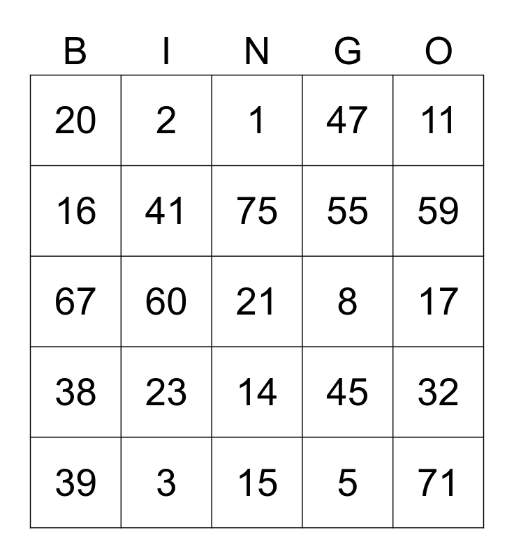 This bingo card has a free space and 24 words: 23, 3, 75, 39, 11, 20, 16, 2, 8, 14, 55, 67, 45, 32, 41, 5, 17, 1, 59, 60, 71, 38, 47 and 15.