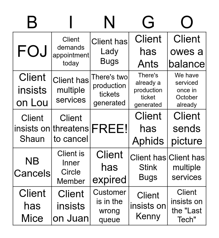 This bingo card has a free space and 24 words: Client is Inner Circle Member, Client insists on Juan, There's two production tickets generated, Client has Mice, Client owes a balance, FOJ, Client insists on Lou, Client demands appointment today, Client has Aphids, Client has expired, There's already a production ticket generated, Client insists on Shaun, Client has Stink Bugs, Client has multiple services, Client has multiple services, Client insists on Kenny, Client sends picture, Client has Lady Bugs, We have serviced once in October already, Client threatens to cancel, Client insists on the "Last Tech", NB Cancels, Client has Ants and Customer is in the wrong queue.