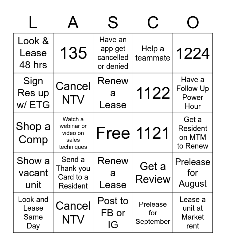 This bingo card has a free space and 24 words: Send a Thank you Card to a Resident, Cancel NTV, Renew a Lease, Look and Lease Same Day, 1224, Look & Lease 48 hrs, Sign Res up w/ ETG, 135, 1121, Renew a Lease, 1122, Shop a Comp, Get a Review, Prelease for August, Cancel NTV, Prelease for September, Get a Resident on MTM to Renew, Have an app get cancelled or denied, Have a Follow Up Power Hour, Watch a webinar or video on sales techniques, Lease a unit at Market rent, Show a vacant unit, Help a teammate and Post to FB or IG.