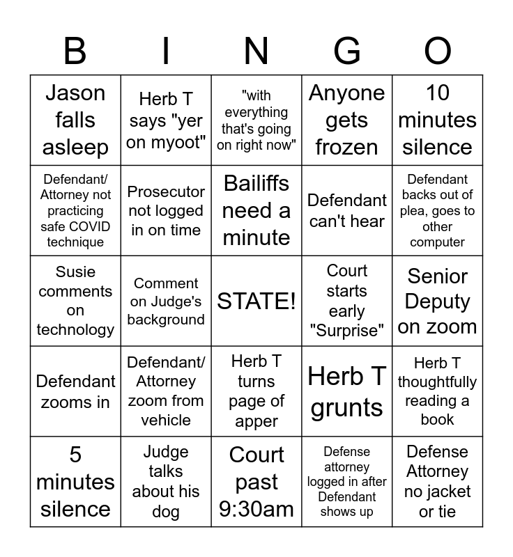 This bingo card has a free space and 24 words: Defendant/ Attorney zoom from vehicle, Judge talks about his dog, Bailiffs need a minute, 5 minutes silence, 10 minutes silence, Jason falls asleep, Defendant/ Attorney not practicing safe COVID technique, Herb T says "yer on myoot", Court starts early "Surprise", Herb T turns page of apper, Defendant can't hear, Susie comments on technology, Herb T grunts, Herb T thoughtfully reading a book, Prosecutor not logged in on time, Defense attorney logged in after Defendant shows up, Senior Deputy on zoom, "with everything that's going on right now", Defendant backs out of plea, goes to other computer, Comment on Judge's background, Defense Attorney no jacket or tie, Defendant zooms in, Anyone gets frozen and Court past 9:30am.