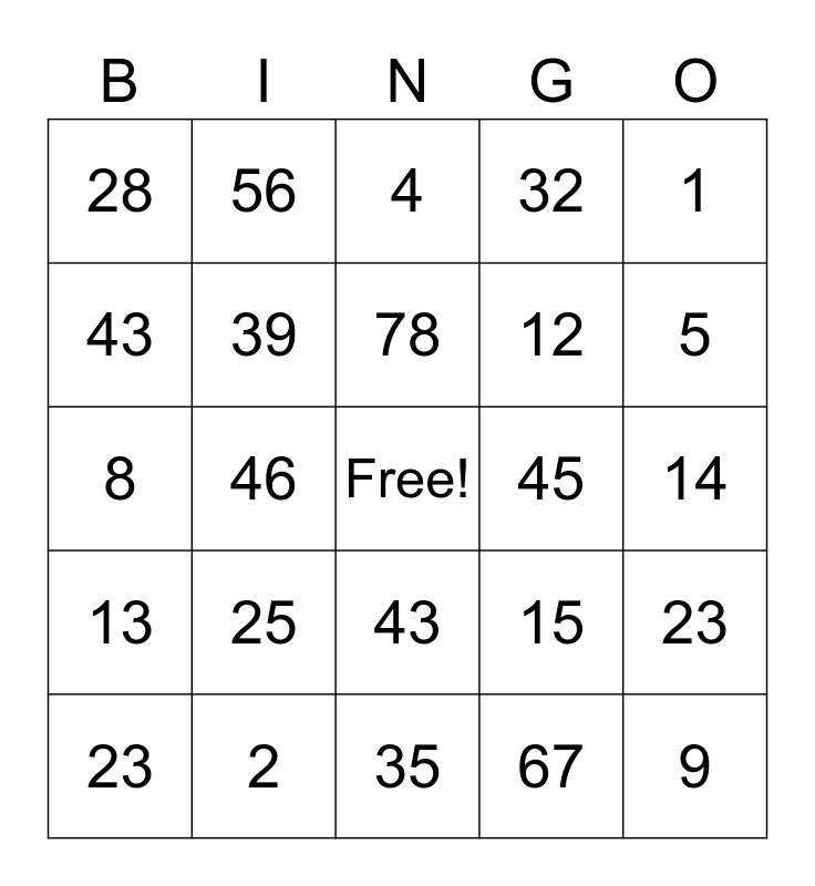 This bingo card has a free space and 29 words: 12, 2, 4, 90, 1, 28, 39, 78, 45, 23, 23, 46, 67, 9, 8, 75, 35, 15, 5, 13, 25, 38, 12, 14, 43, 56, 43, 32 and 80.