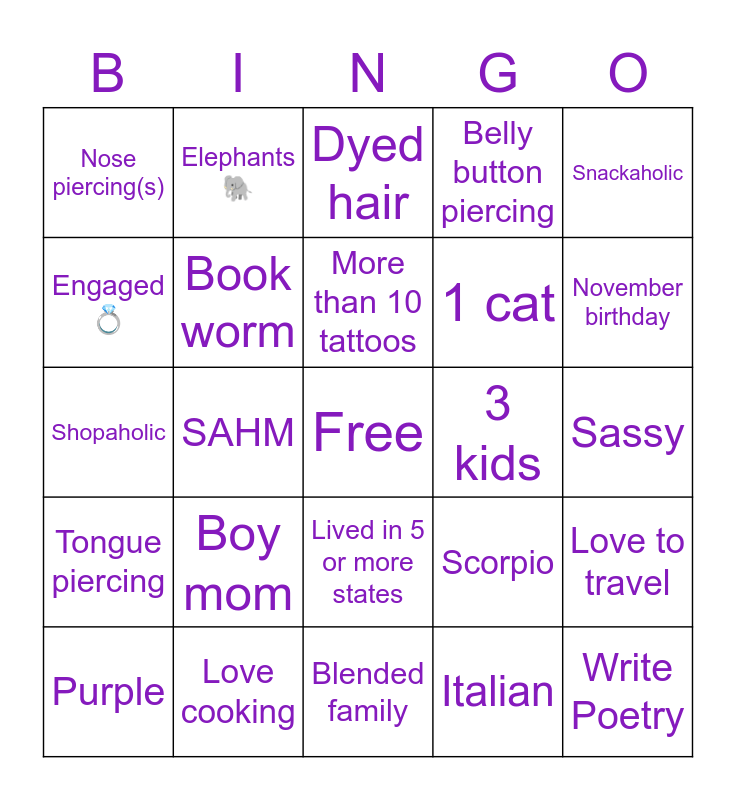This bingo card has a free space and 24 words: Purple, Boy mom, More than 10 tattoos, Italian, Snackaholic, Nose piercing(s), Elephants 🐘, Dyed hair, 3 kids, Sassy, Shopaholic, Book worm, Scorpio, Love to travel, Engaged 💍, Love cooking, Blended family, Belly button piercing, November birthday, Tongue piercing, SAHM, Lived in 5 or more states, 1 cat and Write Poetry.