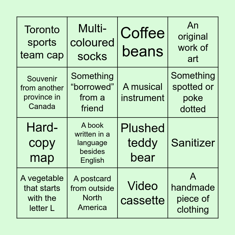 This bingo card has 16 words: A postcard from outside North America, Sanitizer, Coffee beans, Toronto sports team cap, Hard-copy map, Multi-coloured socks, Plushed teddy bear, Video cassette, Souvenir from another province in Canada, Something “borrowed” from a friend, A vegetable that starts with the letter L, An original work of art, A book written in a language besides English, Something spotted or poke dotted, A musical instrument and A handmade piece of clothing.