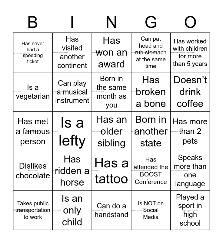 This bingo card has 25 images and 25 words: Has ridden a horse, Can do a handstand, Born in the same month as you, Takes public transportation to work, Has worked with children for more than 5 years, Has never had a speeding ticket, Is a vegetarian, Has visited another continent, Born in another state, Has a tattoo, Has broken a bone, Has met a famous person, Has attended the BOOST Conference, Speaks more than one language, Can play a musical instrument, Played a sport in high school, Has more than 2 pets, Has won an award, Doesn’t drink coffee, Is a lefty, Has an older sibling, Is an only child, Dislikes chocolate, Can pat head and rub stomach at the same time and Is NOT on Social Media.
