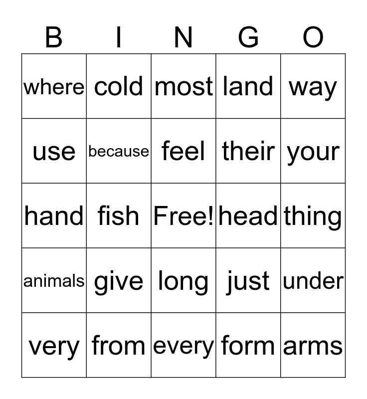 This bingo card has a free space and 24 words: give, from, feel, very, way, where, use, cold, head, long, their, hand, just, under, because, form, thing, most, your, fish, arms, animals, land and every.