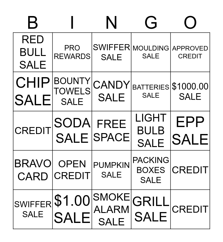 This bingo card has a free space and 24 words: OPEN CREDIT, $1.00 SALE, CANDY SALE, SWIFFER SALE, APPROVED CREDIT, RED BULL SALE, CHIP SALE, PRO REWARDS, LIGHT BULB SALE, PUMPKIN SALE, BATTERIES SALE, CREDIT, PACKING BOXES SALE, CREDIT, BOUNTY TOWELS SALE, GRILL SALE, EPP SALE, SWIFFER SALE, $1000.00 SALE, SODA SALE, CREDIT, BRAVO CARD, MOULDING SALE and SMOKE ALARM SALE.