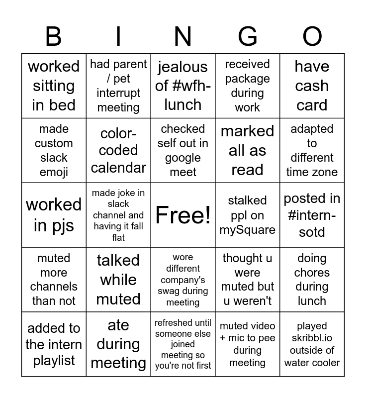This bingo card has a free space and 24 words: talked while muted, ate during meeting, checked self out in google meet, added to the intern playlist, have cash card, worked sitting in bed, made custom slack emoji, had parent / pet interrupt meeting, stalked ppl on mySquare, wore different company's swag during meeting, marked all as read, worked in pjs, thought u were muted but u weren't, doing chores during lunch, color-coded calendar, muted video + mic to pee during meeting, posted in #intern-sotd, jealous of #wfh-lunch, adapted to different time zone, made joke in slack channel and having it fall flat, played skribbl.io outside of water cooler, muted more channels than not, received package during work and refreshed until someone else joined meeting so you're not first.