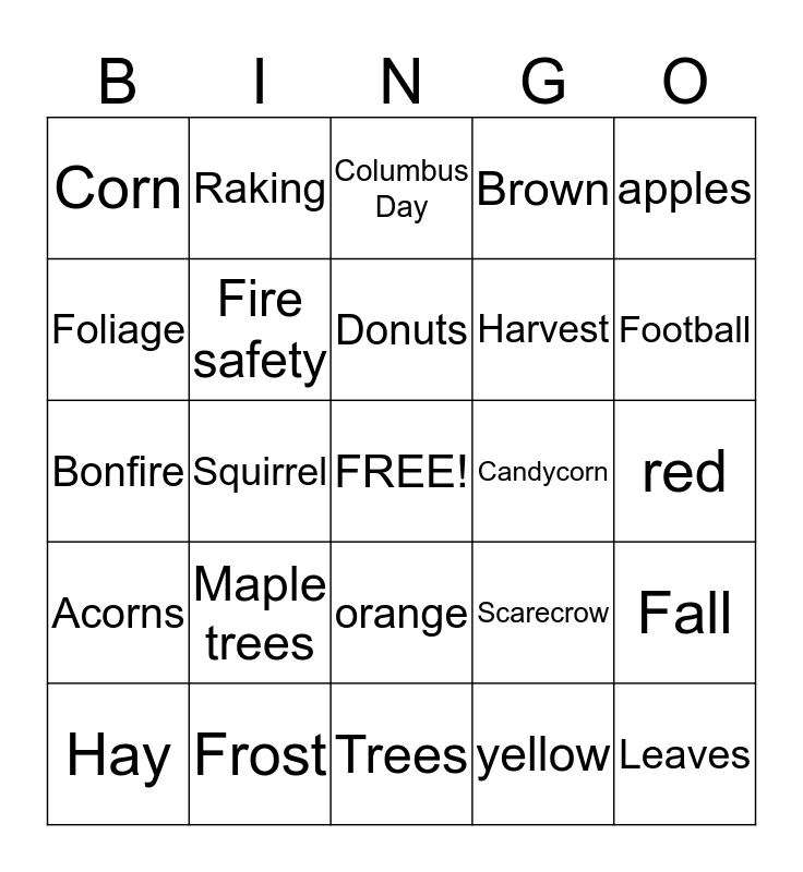 This bingo card has a free space and 31 words: Trees, Windy, Squirrel, Pear, Corn, Columbus Day, Fire safety, Scarecrow, Candycorn, yellow, red, Leaves, Autumn, Pumpkin, Football, Cider, Fall, Maple trees, Acorns, orange, apples, Cold, Hay, Raking, Harvest, Foliage, Brown, Bonfire, Frost, Donuts and Oak tree.