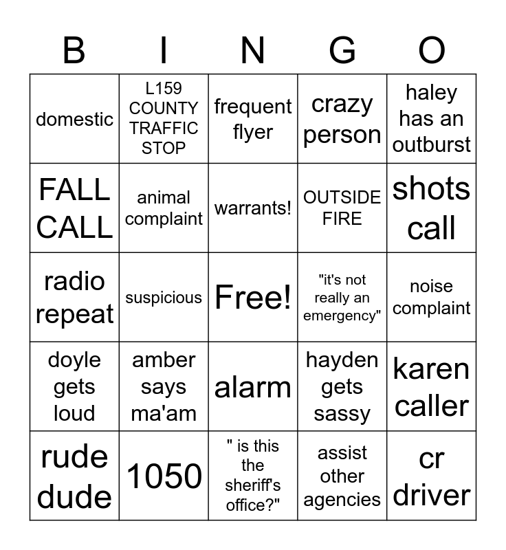 This bingo card has a free space and 30 words: 1050, "JUST GET THEM HERE", suspicious, hangup, domestic, frequent flyer, animal complaint, alarm, "it's not really an emergency", " is this the sheriff's office?", noise complaint, cr driver, assist other agencies, keep the peace, shots call, larceny, hayden gets sassy, doyle gets loud, amber says ma'am, haley has an outburst, radio repeat, mary and hayden get weird, L159 COUNTY TRAFFIC STOP, OUTSIDE FIRE, FALL CALL, crazy person, karen caller, rude dude, warrants! and chest pain.