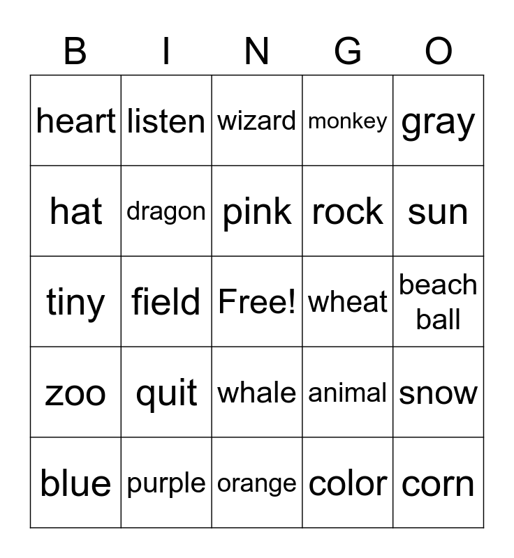This bingo card has a free space and 24 words: quit, purple, pink, blue, gray, heart, hat, listen, wheat, whale, rock, tiny, animal, snow, dragon, color, beach ball, wizard, sun, field, corn, zoo, monkey and orange.