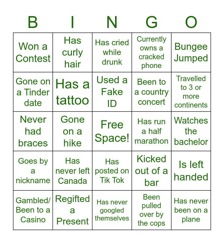 This bingo card has a free space and 24 words: Has never left Canada, Regifted a Present, Used a Fake ID, Gambled/ Been to a Casino, Bungee Jumped, Won a Contest, Gone on a Tinder date, Has curly hair, Has run a half marathon, Has posted on Tik Tok, Been to a country concert, Never had braces, Kicked out of a bar, Is left handed, Has a tattoo, Been pulled over by the cops, Watches the bachelor, Has cried while drunk, Travelled to 3 or more continents, Gone on a hike, Has never been on a plane, Goes by a nickname, Currently owns a cracked phone and Has never googled themselves.