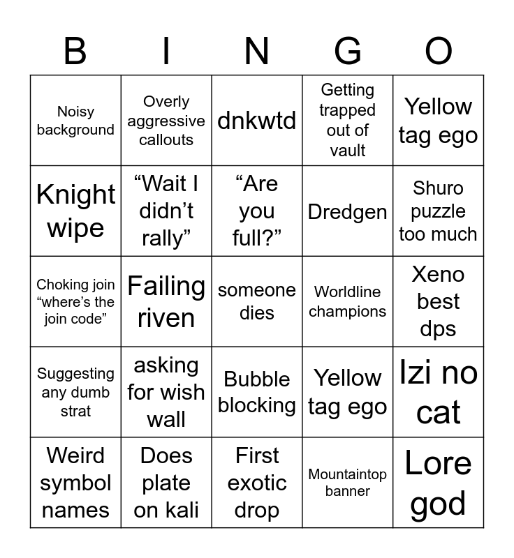This bingo card has a free space and 24 words: asking for wish wall, Does plate on kali, “Are you full?”, Weird symbol names, Yellow tag ego, Noisy background, Knight wipe, Overly aggressive callouts, Worldline champions, Bubble blocking, Dredgen, Choking join “where’s the join code”, Yellow tag ego, Izi no cat, “Wait I didn’t rally”, Mountaintop banner, Xeno best dps, dnkwtd, Shuro puzzle too much, Failing riven, Lore god, Suggesting any dumb strat, Getting trapped out of vault and First exotic drop.