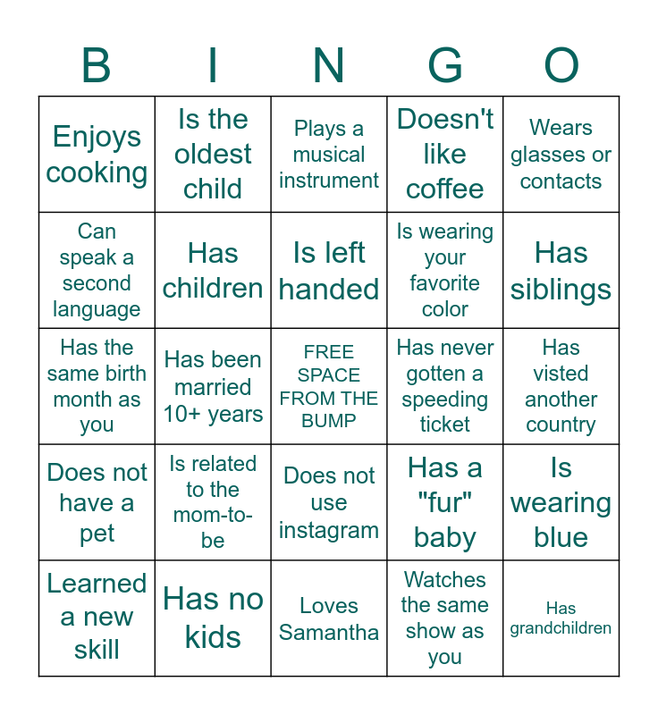 This bingo card has a free space and 24 words: Is related to the mom-to-be, Has no kids, Is left handed, Learned a new skill, Wears glasses or contacts, Enjoys cooking, Can speak a second language, Is the oldest child, Has never gotten a speeding ticket, Does not use instagram, Is wearing your favorite color, Has the same birth month as you, Has a "fur" baby, Is wearing blue, Has children, Watches the same show as you, Has visted another country, Plays a musical instrument, Has siblings, Has been married 10+ years, Has grandchildren, Does not have a pet, Doesn't like coffee and Loves Samantha.