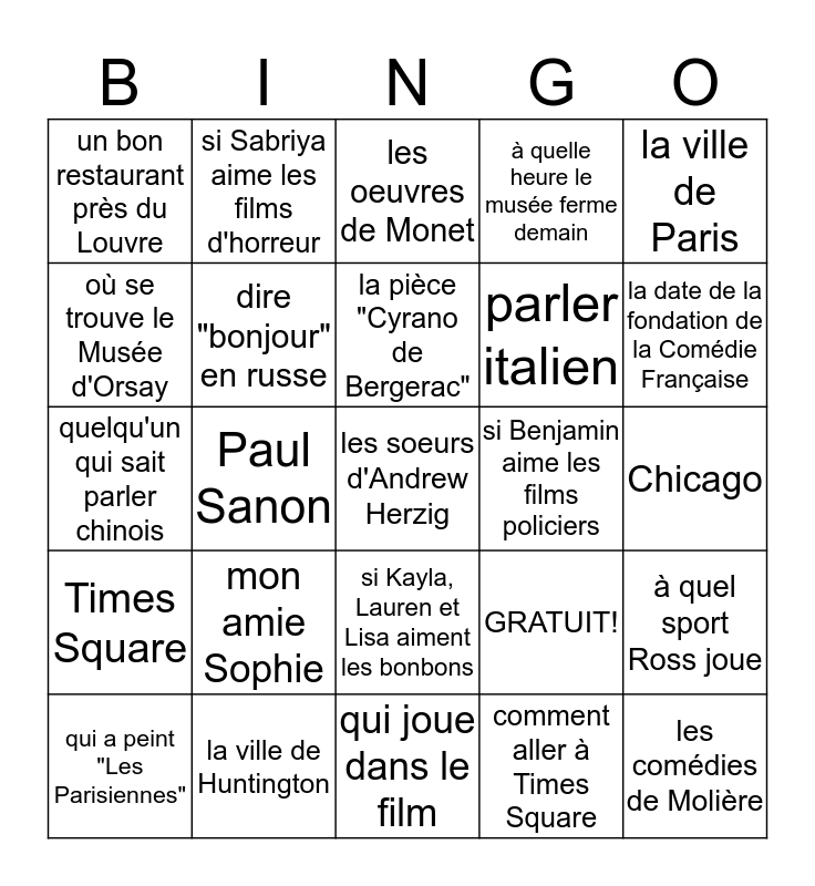 This bingo card has 25 words: mon amie Sophie, qui joue dans le film, la pièce "Cyrano de Bergerac", qui a peint "Les Parisiennes", la ville de Paris, un bon restaurant près du Louvre, où se trouve le Musée d'Orsay, si Sabriya aime les films d'horreur, si Benjamin aime les films policiers, si Kayla, Lauren et Lisa aiment les bonbons, parler italien, quelqu'un qui sait parler chinois, GRATUIT!, à quel sport Ross joue, dire "bonjour" en russe, les comédies de Molière, Chicago, les oeuvres de Monet, la date de la fondation de la Comédie Française, Paul Sanon, les soeurs d'Andrew Herzig, la ville de Huntington, Times Square, à quelle heure le musée ferme demain and comment aller à Times Square.