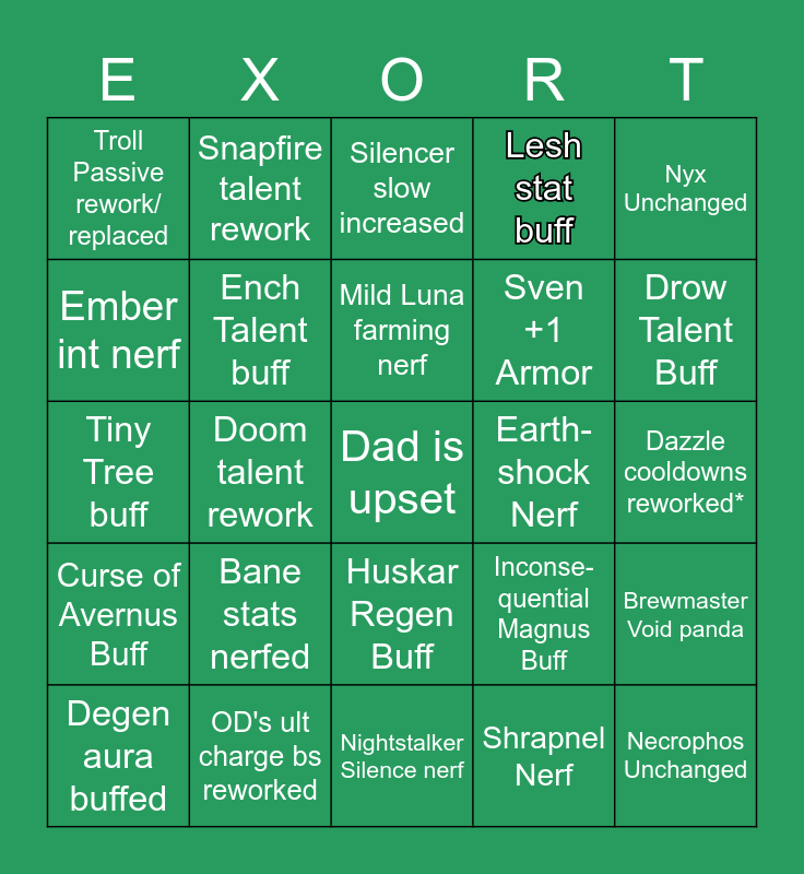This bingo card has a free space and 24 words: Bane stats nerfed, OD's ult charge bs reworked, Mild Luna farming nerf, Degen aura buffed, Nyx Unchanged, Troll Passive rework/ replaced, Ember int nerf, Snapfire talent rework, Earth-shock Nerf, Huskar Regen Buff, Sven +1 Armor, Tiny Tree buff, Inconse-quential Magnus Buff, Brewmaster Void panda, Ench Talent buff, Shrapnel Nerf, Dazzle cooldowns reworked*, Silencer slow increased, Drow Talent Buff, Doom talent rework, Necrophos Unchanged, Curse of Avernus Buff, Lesh stat buff and Nightstalker Silence nerf.