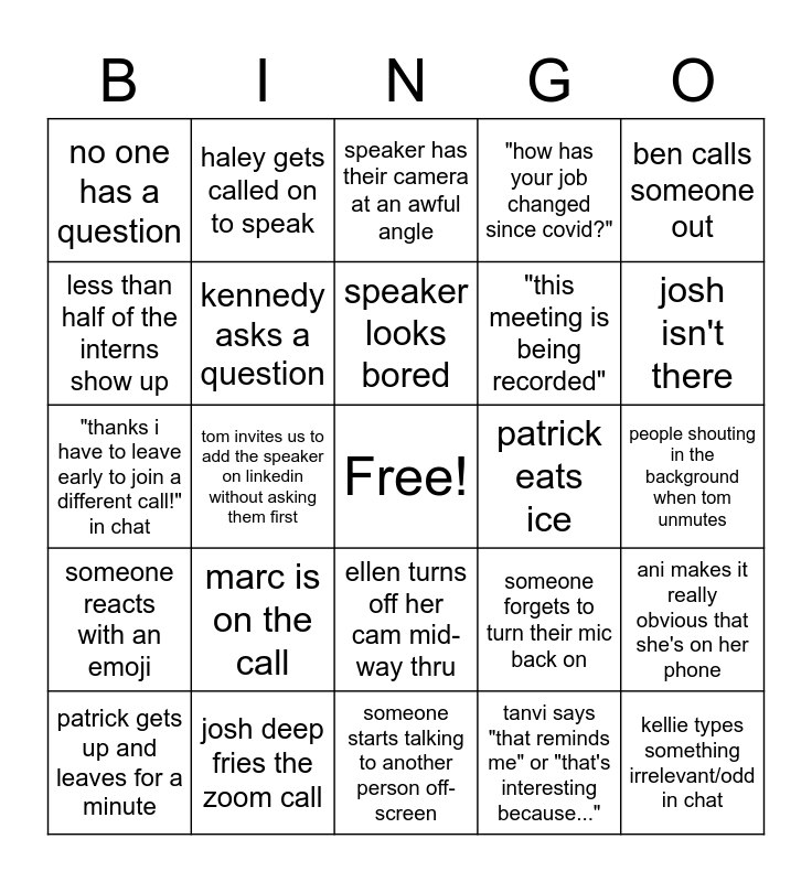 This bingo card has a free space and 24 words: marc is on the call, josh deep fries the zoom call, speaker looks bored, patrick gets up and leaves for a minute, ben calls someone out, no one has a question, less than half of the interns show up, haley gets called on to speak, patrick eats ice, ellen turns off her cam mid-way thru, "this meeting is being recorded", "thanks i have to leave early to join a different call!" in chat, someone forgets to turn their mic back on, ani makes it really obvious that she's on her phone, kennedy asks a question, tanvi says "that reminds me" or "that's interesting because...", people shouting in the background when tom unmutes, speaker has their camera at an awful angle, josh isn't there, tom invites us to add the speaker on linkedin without asking them first, kellie types something irrelevant/odd in chat, someone reacts with an emoji, "how has your job changed since covid?" and someone starts talking to another person off-screen.