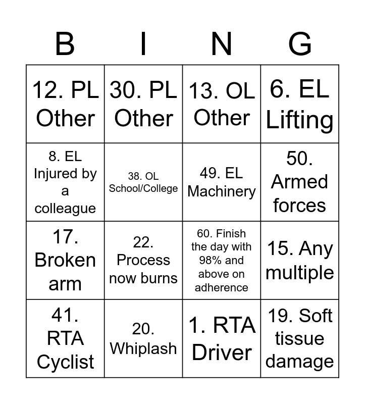 This bingo card has 69 words: Free!, 1. RTA Driver, 2. RTA Passenger, 3. RTA Multiple, 4. MIB Case, 5. EL Ladders, 6. EL Lifting, 7. EL Slip/Trip, 8. EL Injured by a colleague, 9. OL Slip/Trip, 10. OL Injured by a member of staff, 11. PL Road/Pavement defect, 12. PL Other, 13. OL Other, 14. Attack, 15. Any multiple, 16. No hunt group for the day, 17. Broken arm, 18. Broken Ankle, 19. Soft tissue damage, 20. Whiplash, 21. Scarring over 1cm, 22. Process now burns, 23. No lateness from breaks and lunches, 24. Receive an E-Card, 25. RTA Pedestrian, 26. Medical negligence – Surgical complications, 27. Medical negligence – Delay, 28. Medical negligence pregnancy, 29. EL ID RSI, 30. PL Other, 31. Dental negligence, 32. Overcome an objection, 33. Previous legal, 34. Nerve damage, 35. Needlestick injury, 36. EL Other, 37. OL Food poisoning, 38. OL School/College, 39. Animal bite, 40. Claims against the police, 41. RTA Cyclist, 42. Over 5 conversions for the day, 43. Over 10 conversions for the week, 44. EL ID Hearing loss, 45. Unable to weight bare, 46. RTA Public transport, 47. Soft tissue damage, 48. Aggravated injury, 49. EL Machinery, 50. Armed forces, 51. 2x 5 Star trust pilot reviews, 53. Drop down accuracy, 54. Convert last name A-L, 55. Convert last name N-Z, 56. Surname of summer, 57. Lives in a place with on sea in the name, 58. No 2nd Chance, 59. Finish top 3 converters for the day, 60. Finish the day with 98% and above on adherence, 61. Least amount of NFA’S for the day, 62. Address with sun in title, 63. Address with summer in the title, 64. Accident abroad, Claimants birthday in July, 5 star review on trust pilot, 5 seconds or under for wrap, Manager nomination and Most multiples for the week..