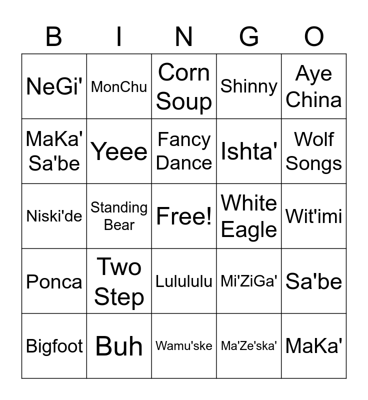 This bingo card has a free space and 29 words: Bigfoot, East Roads, Standing Bear, Tiny Tots, NeGi', Corn Soup, Yeee, Two Step, White Eagle, Buh, Wit'imi, MaKa', Wamu'ske, Ma'Ze'ska', Wolf Songs, Meatpie, Lulululu, Ponca, Aye China, Niski'de, Mi'ZiGa', Nu'ZiGa', Ishta', MaKa' Sa'be, Shinny, MonChu, Sa'be, Fancy Dance and Deer Woman.