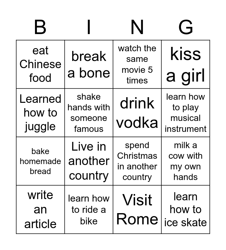 This bingo card has 16 words: learn how to ride a bike, milk a cow with my own hands, watch the same movie 5 times, eat Chinese food, bake homemade bread, break a bone, spend Christmas in another country, Visit Rome, Learned how to juggle, shake hands with someone famous, write an article, kiss a girl, Live in another country, learn how to play musical instrument, drink vodka and learn how to ice skate.