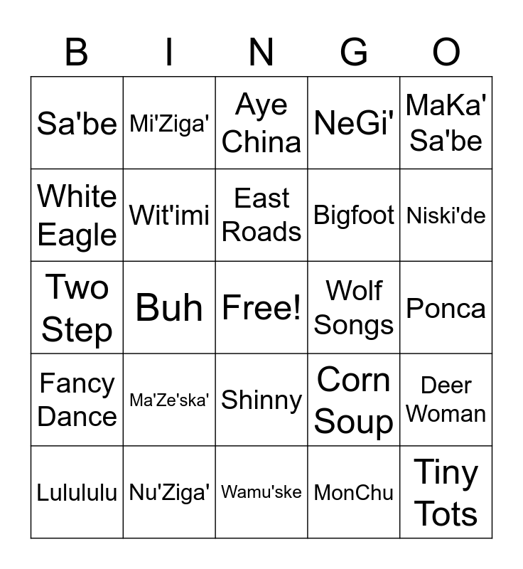 This bingo card has a free space and 29 words: Lulululu, Ishta', Buh, MaKa', Sa'be, Aye China, Wit'imi, Ma'Ze'ska', Wolf Songs, Nu'Ziga', Ponca, Tiny Tots, Wamu'ske, MonChu, Niski'de, Yeee, Shinny, Fancy Dance, MaKa' Sa'be, Two Step, Corn Soup, Standing Bear, Bigfoot, White Eagle, NeGi', Mi'Ziga', Deer Woman, East Roads and Meatpie.