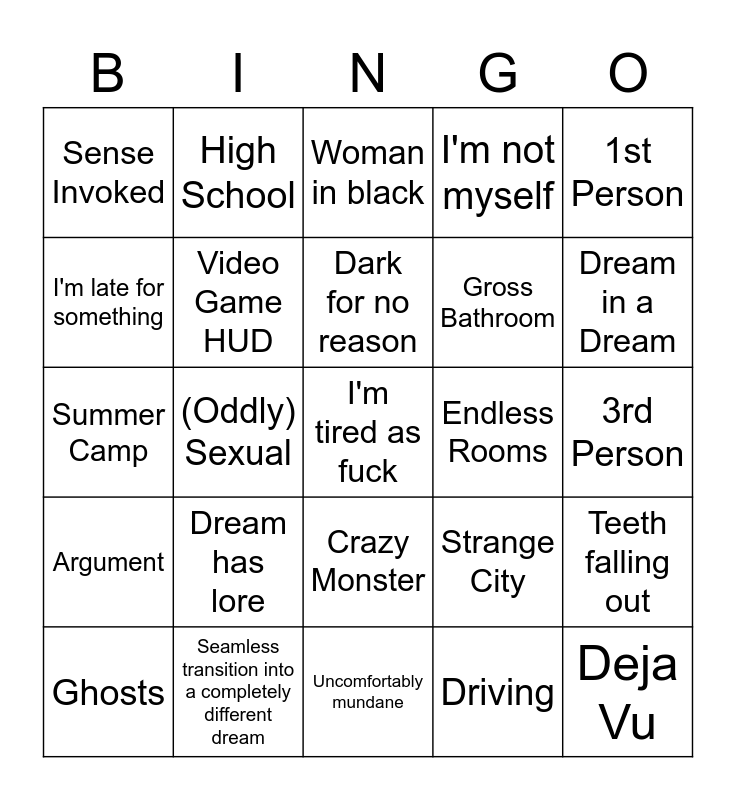 This bingo card has a free space and 24 words: Dream has lore, Seamless transition into a completely different dream, Dark for no reason, Ghosts, 1st Person, Sense Invoked, I'm late for something, High School, Endless Rooms, Crazy Monster, Gross Bathroom, Summer Camp, Strange City, Teeth falling out, Video Game HUD, Driving, 3rd Person, Woman in black, Dream in a Dream, (Oddly) Sexual, Deja Vu, Argument, I'm not myself and Uncomfortably mundane.